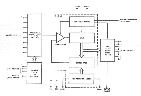 Nell’ADC0808 è racchiuso un intero sistema di acquisizione dati infatti nell’unico chip è contenuto un multiplexer analogico ad 8 canali, appositi latch nonché dei buffer 3-state in uscita per l’interfacciamento a bus.