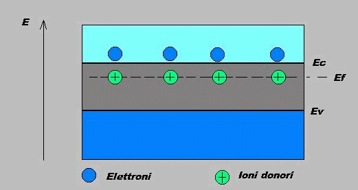 Ogni atomo di impurità " dona" un elettrone assumendo quindi il ruolo di " donore " e contribuendo alla conducibilità dovuta, in questo caso, agli elettroni. L'atomo donore, perdendo un elettrone rimane, però, ionizzato per cui sugli atomi droganti resta localizzata una carica positiva intrappolata nel reticolo.